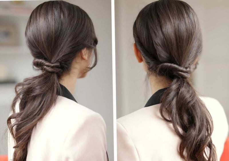 - Кончик фиксируют резинкой или заколкой. Крепление допустимо замаскировать собственной прядью.