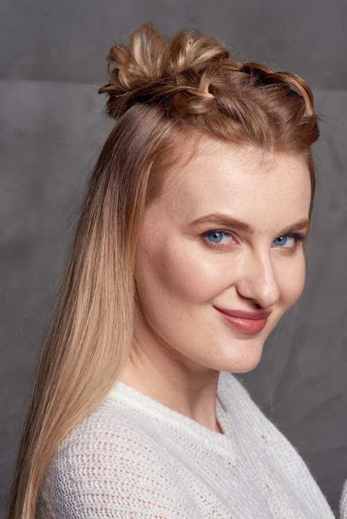 При этом совсем не обязательно плести классическую косичку посередине. Выполните боковое или диагональное плетение, сделайте 2 симметричные косички и соедините их в пучок.