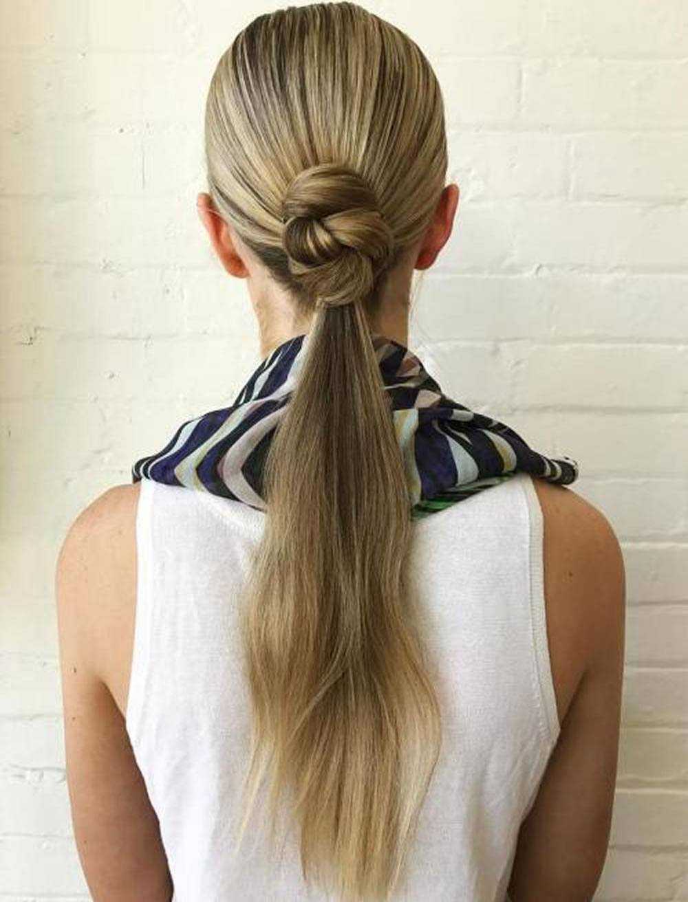 - Возьмите первую прядь волос, как половину хвоста, и наденьте на нее ленту в виде пончика, пока она не достигнет основы. Сдвиньте пучок пончиков вверх полностью вниз, пока он не окажется в дюйме от кончиков волос.
