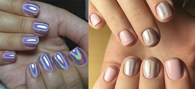 На этом дизайн с эффектом голограммы готов. Рассмотрим самые актуальные варианты голографического маникюра.