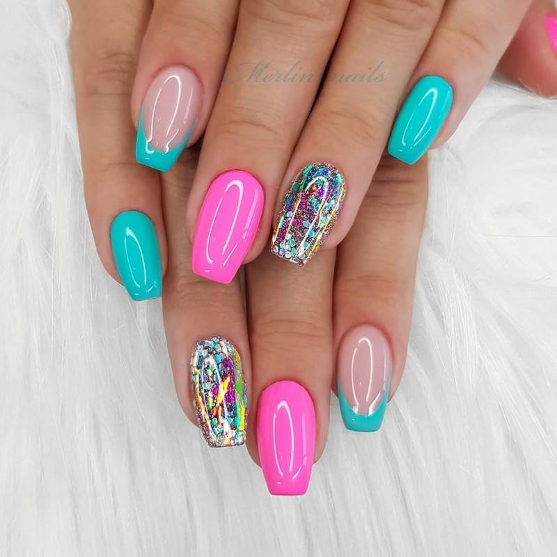 Сочетание розового и голубого уже смело можно назвать классикой. Яркое, сочное, привлекательное решение, особенно популярное у молодых женщин, идеально подходит для летнего маникюра, такого же насыщенного, как и пейзажи в это время. Отлично смотрится бело-розовое или бело-голубое «омбре», украшенное голубыми пайетками в виде незатейливых узоров. Беспроигрышно смотрится чередование розового и голубого лака с небрежной россыпью голубых блесток. Бледно-розовым можно покрыть все ногти, кроме одного-двух, а остальные покрыть голубыми блестками на бесцветной основе. Главное, нежные оттенки сочетать с пастелью, а яркие с такими же насыщенными блестками, в том числе на основе светло-голубого лака. А игра с матовым покрытием остается популярной: несколько ногтей с розовыми матовыми ногтями, один-два можно украсить блестящими украшениями.