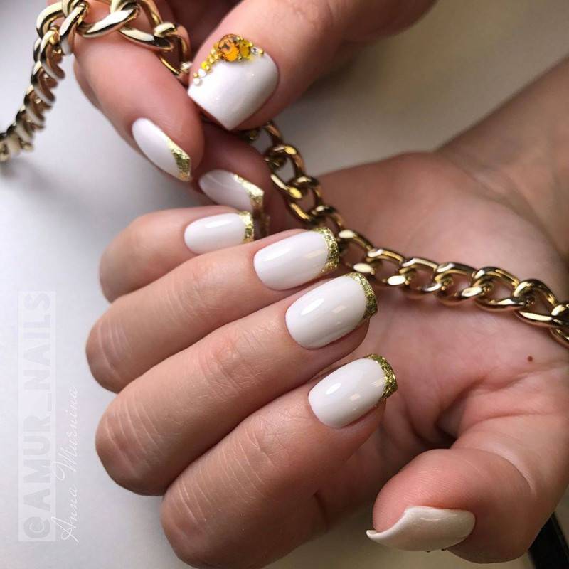модный белый френч с рисунком из золотого песка на короткие ногти
