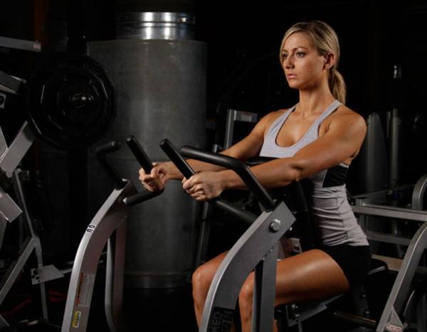 - Подготовьте оборудование. Настройте высоту сидения тренажера под свой рост. При выполнении движения ваши кисти должны быть направлены к поясу.