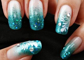 | Блестящий | Переход на таких ноготках осуществляется, не играя степенью насыщенности пигмента, а играя степенью концентрации самих блесток |