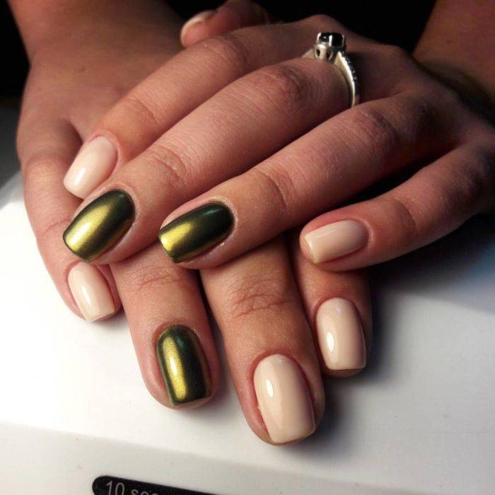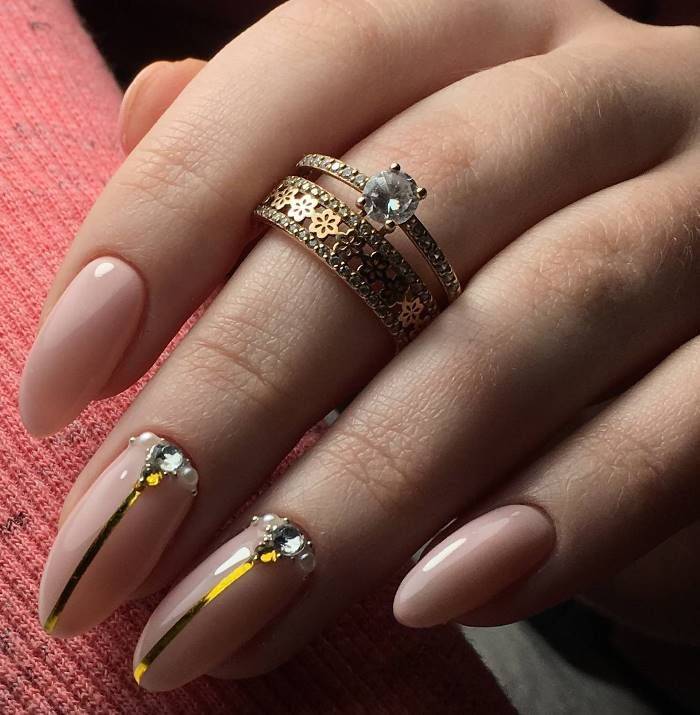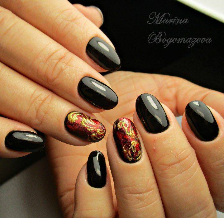 Для создания модного осеннего маникюра прекрасно подойдет золотое (золотой маникюр), медное или бронзовое покрытие ногтей. Это может быть фольгирование, маникюр с блестками или стразами, которые будут переливаться на солнце. Альтернативным вариантом может быть лак с наполнителем или перламутром.