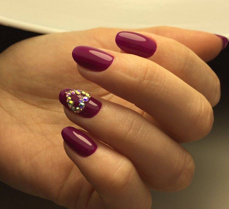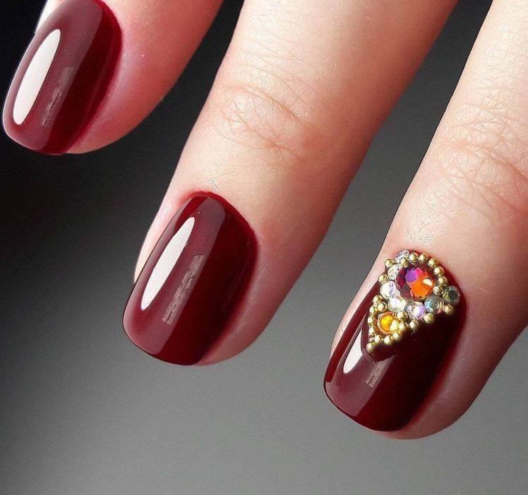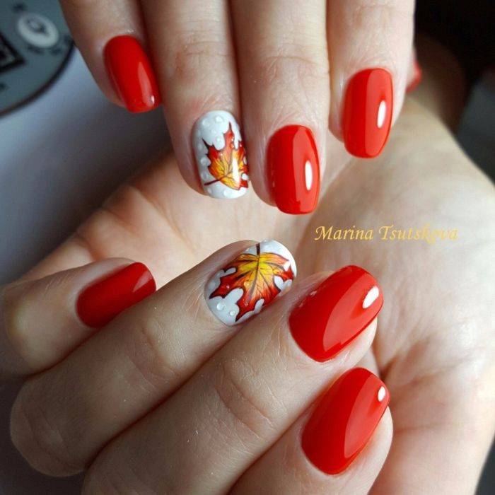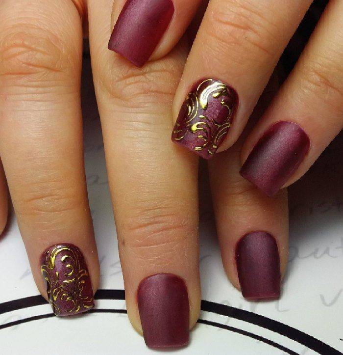 Эти благородные оттенки лучше всего оставлять «чистыми», не смешивая с другими цветами. Например, однотонное матовое покрытие, лунный маникюр или цветной французский маникюр. Если уж очень хочется рисунок на ногтях, то лучше декорировать один ноготок с помощью аппликации или росписи на осеннюю тематику.