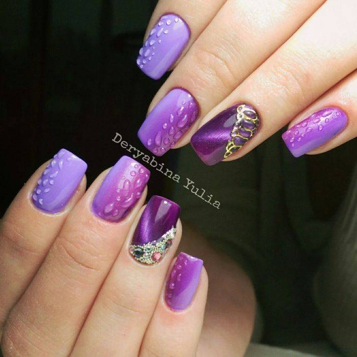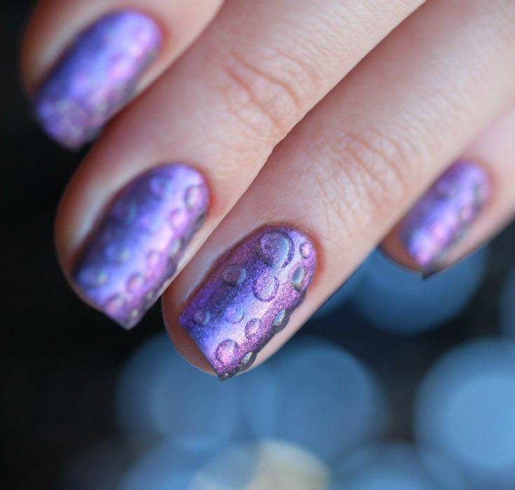 Осенний маникюр ассоциируется с пожелтевшей листвой, но для более позднего периода характерными уже становятся холодные сине-серые оттенки, которые также можно использовать при дизайне ногтей. В качестве декора можно изобразить капельки дождя. Их аккуратно рисуют тонкой кистью либо используют сочетание цветного и прозрачного лака (как показано на фото ниже).