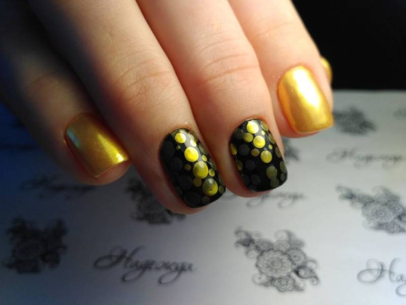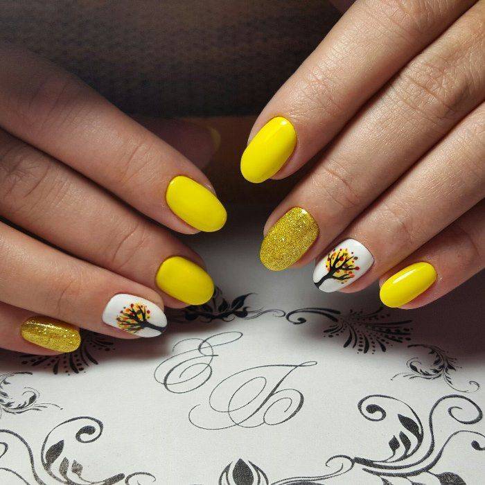 Осенний маникюр просто немыслим без этих оттенков. Вот только холодные желтые оттенки, которые были так популярны летом, лучше заменить на более теплую цветовую гамму, дизайн ногтей при этом может быть разным.