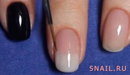 - На линию улыбки нанести второй цвет. Взять смоченную в обезжиривателе веерную кисть, и начать активно мести ею по ноготку, смешивая, таким образом, цвета. Пальчики просушить.