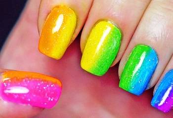 Разнообразие радужных покрытий достигается не только многочисленными комбинациями тонов, но и трафаретами, стразами, блестками – все технологии сочетаемы с гибридом геля и лака и дают прекрасный результат. А как только эта техника будет освоена, можно пробовать делать целые картинки гель лаком.