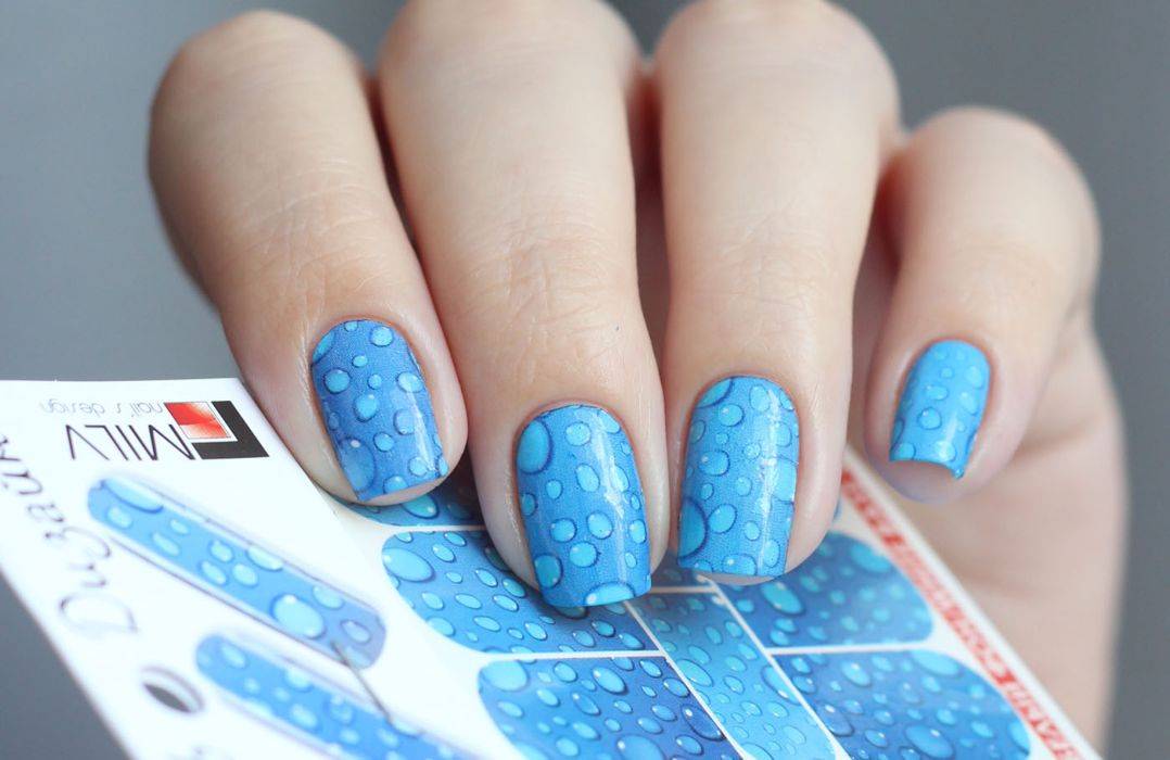 Осенний маникюр ассоциируется с пожелтевшей листвой, но для более позднего периода характерными уже становятся холодные сине-серые оттенки, которые также можно использовать при дизайне ногтей. В качестве декора можно изобразить капельки дождя. Их аккуратно рисуют тонкой кистью либо используют сочетание цветного и прозрачного лака (как показано на фото ниже).