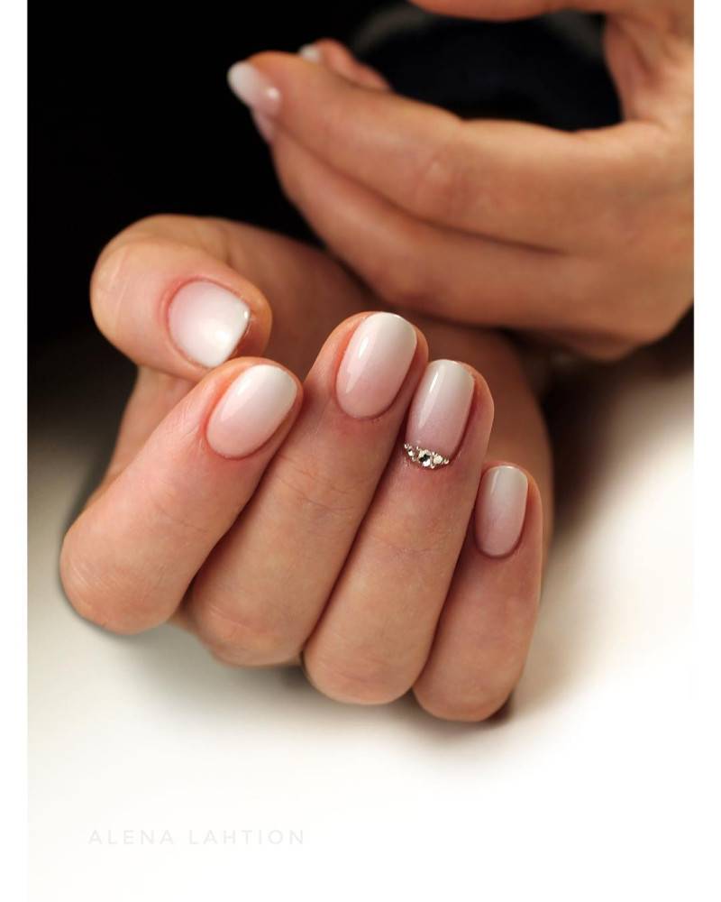 - Baby boomer. Это одна из модных разновидностей деграде, которая совмещает в себе классический французский дизайн с техникой горизонтального градиента. Смотрится нейл-арт очень изысканно и элегантно. Для создания дизайна используют нюдовые оттенки с переходом к белому, по мере движения к краю ногтя. Кроме изящества, этот вариант притягателен тем, что можно делать подобный нежный градиентный маникюр на короткие ногти, равно как и на длинные.
