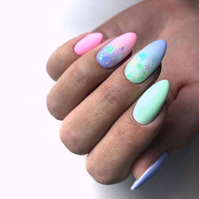 Дизайн ногтей градиент примечателен уже потому, что переход в нем осуществляется не только между темными и светлыми тонами одного цвета. Девушка может выбрать абсолютно любые оттенки и постараться соединить их между собой. В этом его плюс – неожиданная комбинация становится оригинальным решением и позволяет владелице выделиться. Варьируя цветовой гаммой и видами градиента, можно получить уникальный рисунок.