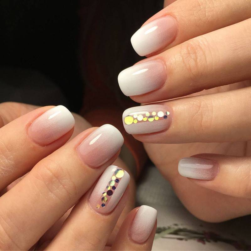 В домашних условиях проще всего сделать градиент с помощью простой губки. Для этого необходимо покрыть ноготки основным светлым оттенком. Чаще всего это белый, бежевый или светло-розовый цвет.