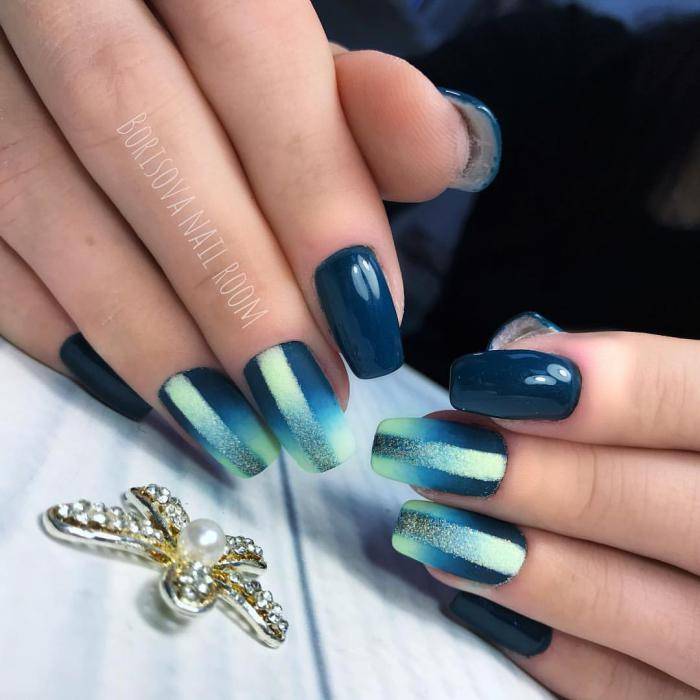 - Блестящий. Как таковой игры цветов здесь нет, используется только один лак. К нему добавляются блестки, количество которых будет уменьшаться ближе к границе перехода.