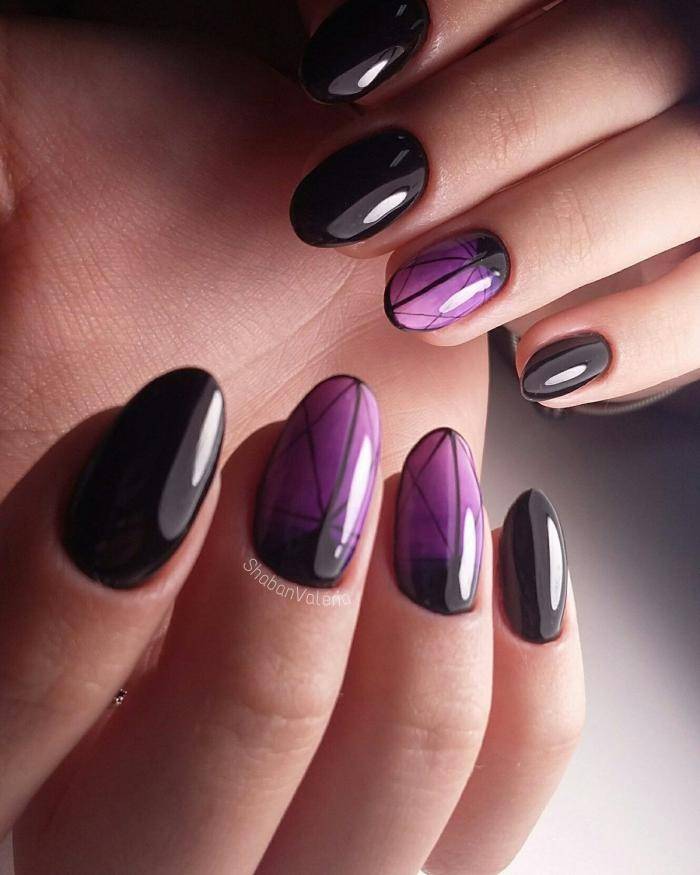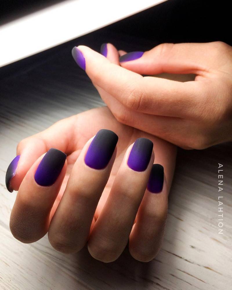 - Градиент на каждом пальце. Ногти покрываются различными лаками. От светлого оттенка к тёмному. Хороший вариант для коротких ногтей.