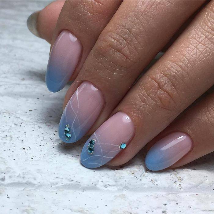 - 2 путь — нанести градиент –Нанести на ноготь базу для дизайна. Например, белого цвета. Отправляем сушиться в лампу. Затем цветной лак только на верхушечку ноготка и быстрыми движениями губки промачивать ноготь. По мере выравнивания тона нужно уменьшать нажим. Процедуру повторить несколько раз до желательного вида ногтей. От количества слоев будет зависеть желаемый эффект. Затем покрыть топом и высушить.