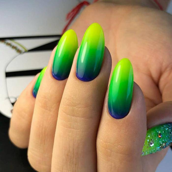 - 1 путь — нанести градиент губкой — Нанести на ноготь базу для дизайна. Потом ногтевой визит в лампу. На металлической «бумаге » нужно поставить несколько жирных капель, жирные капли гель-лака, белую и зеленую, например, на маленьком промежутке. Миксуем между ними промежуточный цвет. Хорошо вымачиваем в это губочку, тщательно впитывая цвет. Первые 2-3 отпечатка вместе с пузырьками ставить нужно на фольгу. Последующие отпечатки будут уже без пузырьков. Теперь и следует перенести гель-лак на ноготок мягкими, но пружинящими движениями с частым шагом. И так несколько пластов, пока тон не станет такими, каким нужно владельцу ногтей. Не нужно бояться неровностей. Топ их сделает незаметными. Получился очень плавный и красивый градиент. И потрясающий дизайн ногтей на зависть подружкам.