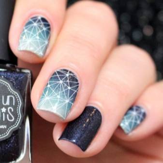 - Градиентный маникюр с геометрическим рисунком. Еще один модный тренд 2020-го. С ним точно придется повозиться, но результат того стоит. Какое именно выбрать решение, зависит от формы и длины ногтей, а еще от индивидуальных предпочтений. Можно рисовать на пластинах вертикальные и горизонтальные полосы, ромбы и другие фигуры.