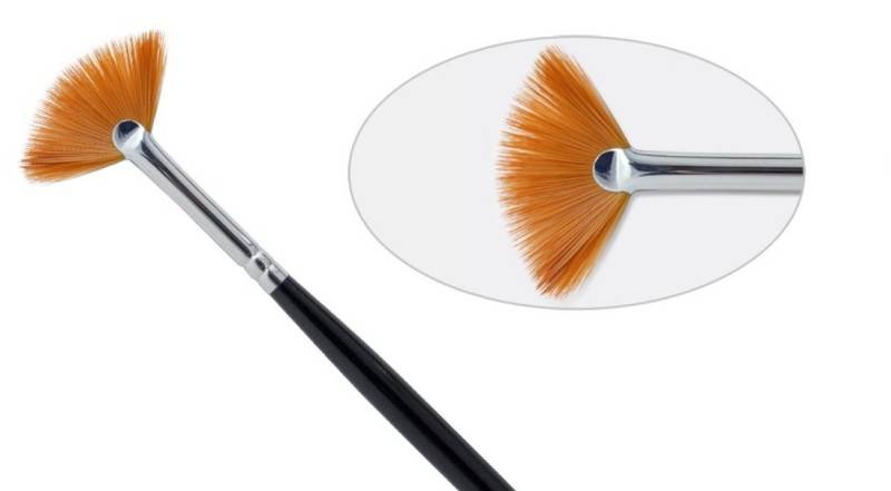 Веерная кисть. Предназначена специально для выполнения градиентного маникюра. Подходит для работы с шеллаками. После нанесения разных оттенков на ноготь веерной кистью размывают границы и получают нужный результат.