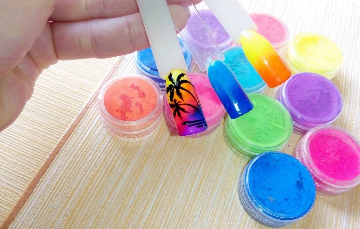 Пигмент. Как и пудра, пигмент наносится на липкую базу похлопывающими движениями. Его частицы очень мелкие, в результате на ноготках создаётся эффект размытости цветов.