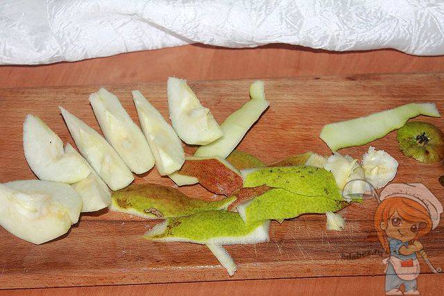 Грушу помыть и обсушить. Срезать тонким слоем шкурку фрукта, из мякоти вырезать сердцевину. Сам плод нарезать на кусочки.