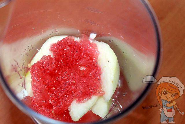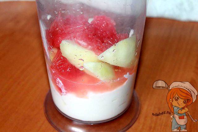 - добавить 100 мл ананасового сока, очищенный грейпфрут и треть стакана кефира;