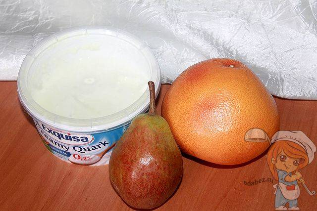 Подготовить грейпфрут, крупную грушу и йогурт. Лучше всего использовать обезжиренный или маложирный молочный продукт. Грушу можно заменить любым другим фруктом: бананом, персиком, абрикосом, грушей яблоком и т.д.