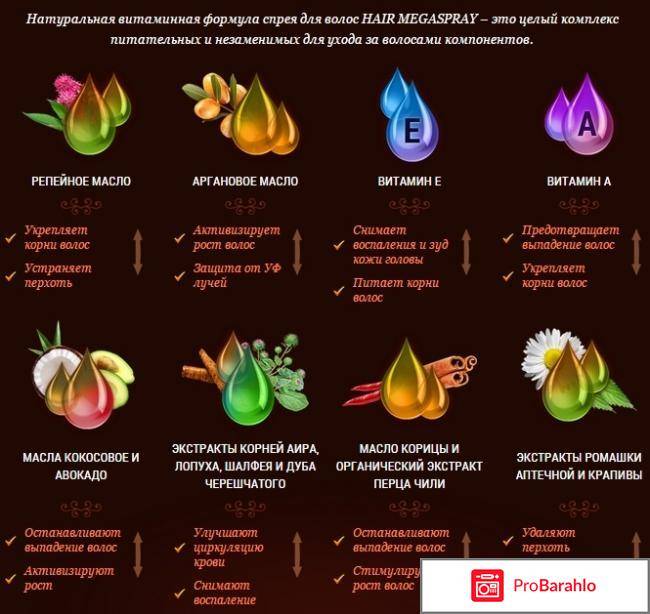Hair Megaspray – это популярный спрей для волос, благодаря которому улучшается питание волосяных луковиц, и улучшается рост волос. К тому же, данный спрей способствует тому, чтобы волосы приобрели здоровый вид, и меньше выпадали, ведь он состоит лишь из натуральных ингредиентов, среди которых следует выделить аргановое и репейное масло, экстракт чилийского перца, а также полезные растения, богатые на витамины.