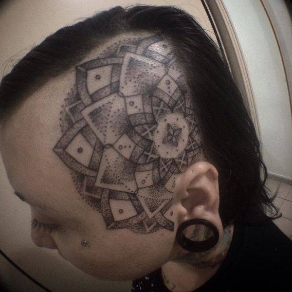 У мужчин голова чаще задействована под нанесение тату, чем у женщин. Возможно это связано с особенностями восприятия своей внешности. Популярные мужские тату выполняются в этнических стилях. На первом месте стоят . Четкие и ровные линии подчеркивают форму черепа, выделяя его положительные стороны.