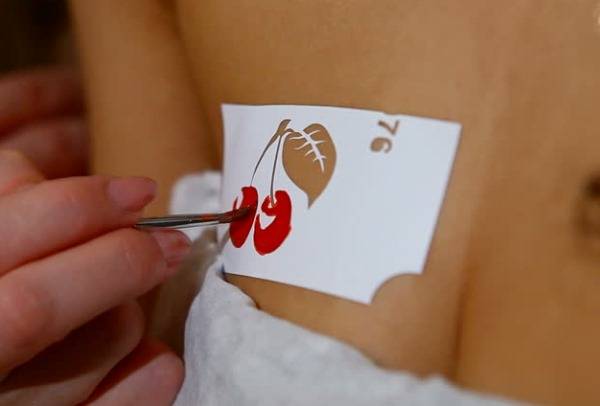 Затем трафарет прикладывают к коже так, чтобы он плотно соприкасался с ней. Предотвратить смещение трафарета поможет обычный или двухсторонний скотч, которым следует приклеить бумагу к коже.