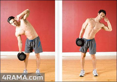 - Наклоны в стороны. Их можно выполнять с отягощением или же просто поднять вверх прямую руку и тянуться в противоположную сторону с ее помощью.