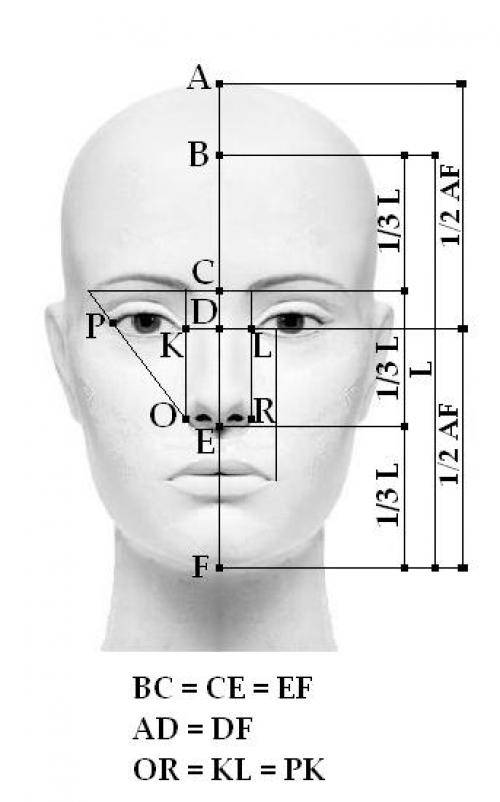 Согласно Леонардо да Винчи• расстояние между глазами должно быть равным расстоянию от внутреннего угла глаза до внешнего, и такой же должна быть ширина носа;•расстояние между уголками рта должно равняться расстоянию между радужками глаз;•низ мочек ушей должен быть на одной линии с кончиком носа;•верх ушей должен касаться воображаемой линии, проведённой по бровям,•если провести параллельно друг другу четыре воображаемые горизонтальные линии, одну по верхнему краю лба, вторую по линии бровей, третью через основание носа, четвёртую по низу подбородка, то в идеале должны получиться три равные по высоте части;•линия, проведённая через зрачки глаз, должна поделить пополам воображаемую вертикальную линию, соединяющую кончик подбородка и макушку;•идеальные брови должны начинаться в точках пересечения самих бровей и линий, проведённых через внутренние уголки глаз и крайние точки основания носа.