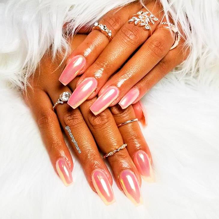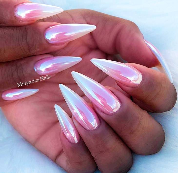 Дерзкий и необузданный, снова возвращается в моду острый перламутровый маникюр. Станет отличным решением на среднюю длину. Подойдет девушкам, предпочитающим накладные ногти.