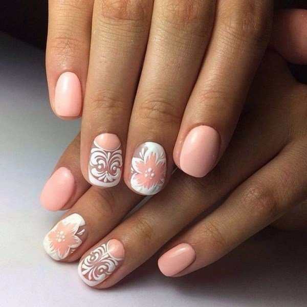 Маникюр персикового цвета с цветами