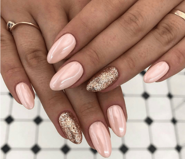 Персиковый маникюр в форме полумесяца в сочетании с блестками получается особенно привлекательным. Чтобы подчеркнуть форму полумесяца, удачно используются золотые или серебряные акценты. Также можно применить технику негативного пространства. Этот дизайн наиболее красиво смотрится на ногтях средней длины.