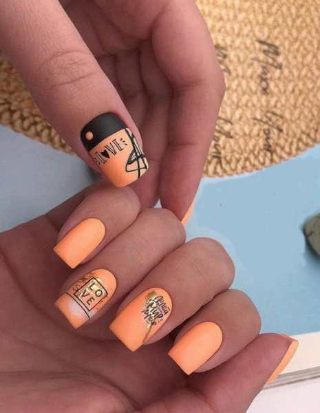 Даже без глянцевого блеска персиковый матовый нейл-арт очень эффектно смотрится на ногтях абсолютно разной длины. В этом сезоне в нейл-арте будут присутствовать мотивы логотипов, изображающие названия известных брендов, слоганы и крылатые фразы