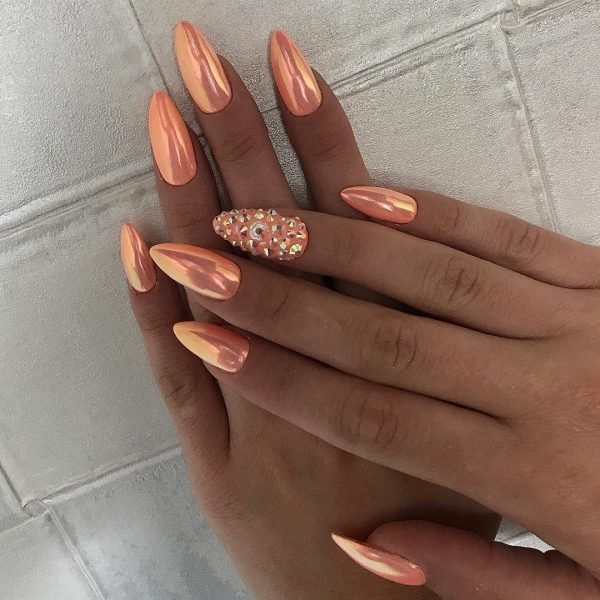 Еще один прекрасный вариант – втирка. Особый порошковый пигмент полностью изменит внешний вид вашего маникюра. Вы можете выбрать втирку персикового цвета и нанести ее на все пальчики – получится эффект полированного металлического покрытия, но в необычном прекрасном цвете.