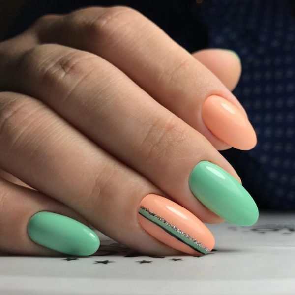 Популярная новинка 2022 года — нейл-арт с персиковыми и мятными оттенками. Успокаивающие цвета гармонично сочетаются друг с другом и идеально подходят для весенне-летнего нейл-арта. Стильные геометрические узоры в виде стильных полосок придают дизайну оригинальную изюминку.