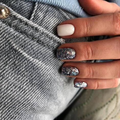Серый маникюр очень часто дополняют дизайном с блестками одного или двух пальчиков. Такой маникюр подходит как для повседневного образа, так и для праздничного выхода в свет.