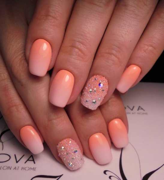 Градиент является одним из самых оригинальных вариантов оформления ногтей. Техника подразумевает плавный, едва заметный переход от темного к светлому, или наоборот. Дизайн ногтей в розово-оранжевом цвете с переходом на нежно-апельсиновый выглядит потрясающе.