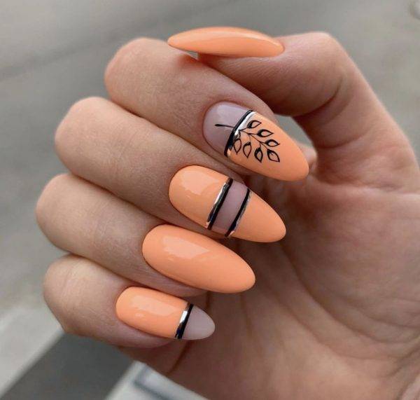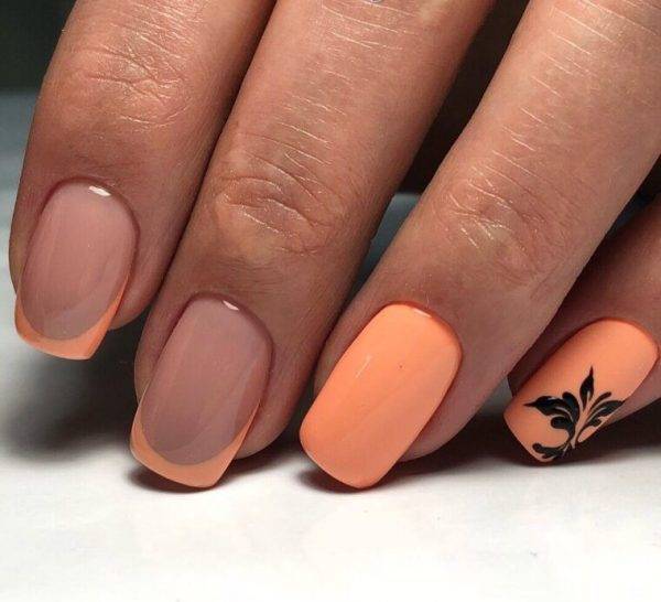 Персиковый с черным очень часто можно увидеть в модных ногтевых дизайнах. Именно черный цвет, как нельзя лучше оттеняет нейтральный тон. Черные рисунки на бежево-персиковом фоне смотрятся стильно, броско.