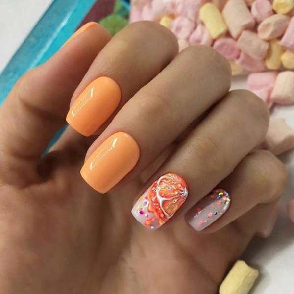 Персиковый цвет — отличный выбор для летнего нейл-арта. Этот оттенок подходит для создания ярких фруктовых и ягодных узоров. Малина, апельсины, лимоны, киви, клубника и вишня — сочный и эффектный дизайн для долгожданного летнего отдыха. Чтобы узоры были более заметны, их следует делать на безымянном и мизинцевом пальцах.