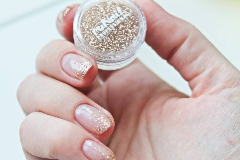 Такие ногти притягивают внимание, даже если за основу взята нюдовая палитра. Пигмент втирают в лак или топ