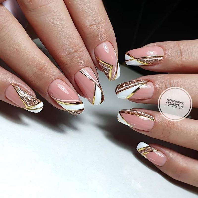 Приходится по душе настоящим леди. Естественный тон и золотой перелив отлично смотрятся в сочетании с золотой фольгой, ветвистыми узорами и френчем. Неплохо выглядят геометрические узоры и пайетки.