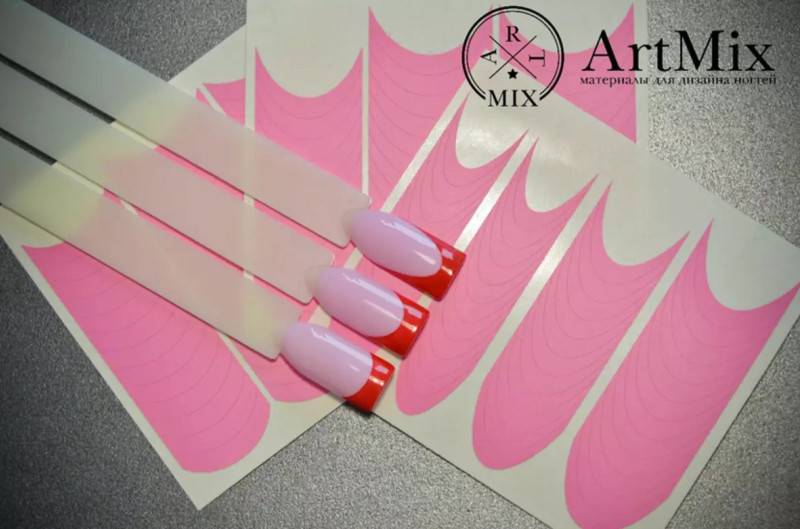Современный и стильный маникюр френч можно сделать даже при отсутствии навыков, если купить трафареты. Это – широкие, узкие или фигурные полоски, либо элементы в виде уголка, сердечка, волн. Их внутренняя поверхность клейкая и легко убирается с основы.