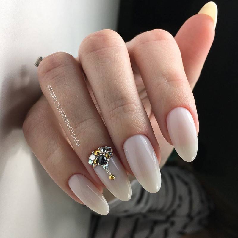 Когда поиск основывается на понятиях нежности и женственности в качестве маникюра предлагается остановить свой выбор на ногтевую форму миндаль, где есть нюдовые оттенки, а также блески в качестве дополнений.