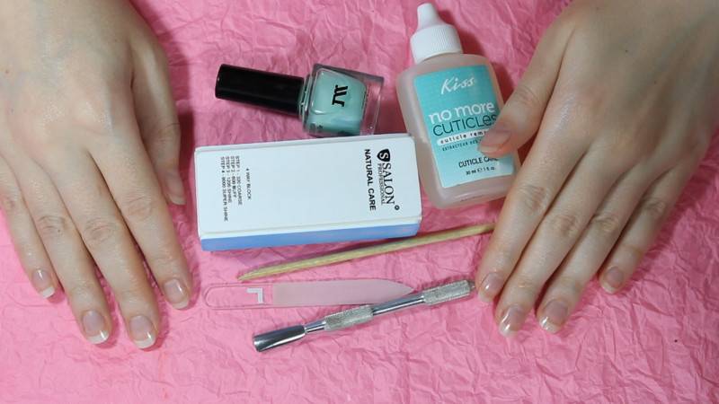 Первым делом подготавливают инструменты и материала для маникюра. Понадобятся средства для удаления или отодвигания кутикулы, пилочки и прочие стандартные принадлежности.