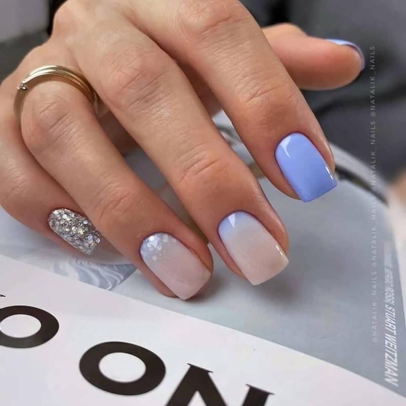 Если вы ищете интересные идеи с фото для маникюра на коротких ногтях на весну и лето, обратите внимание на все оттенки голубого, но в пастельной гамме. Ориентиром станет незабудковый или небесный тон