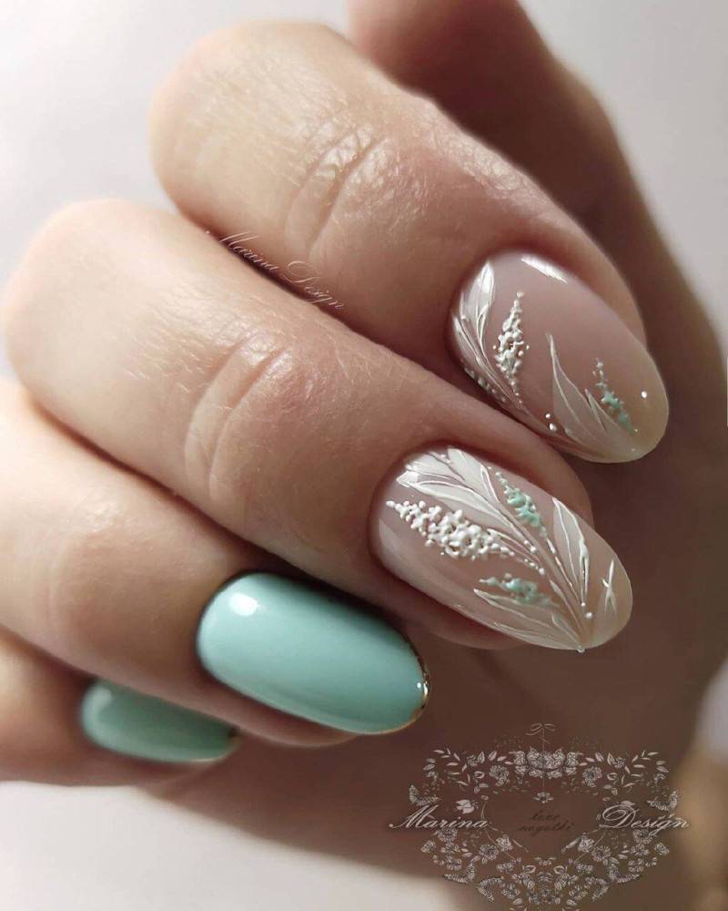 За основу можно взять и пастельные тона, главное внимание стоит уделить именно деталям, таким как добавление блесток, акриловых красок, декоративного песка в дизайн. Также придать оригинальности маникюру можно с помощью стемпинга и трафаретов, для их нанесения рекомендуется использовать такие оттенки как мята, изумруд, персик, небесный, розовый или сиреневый